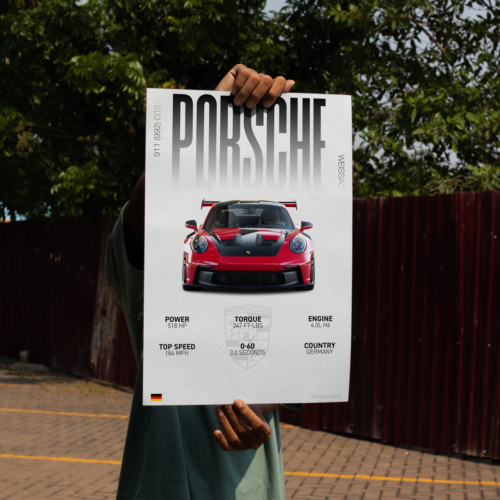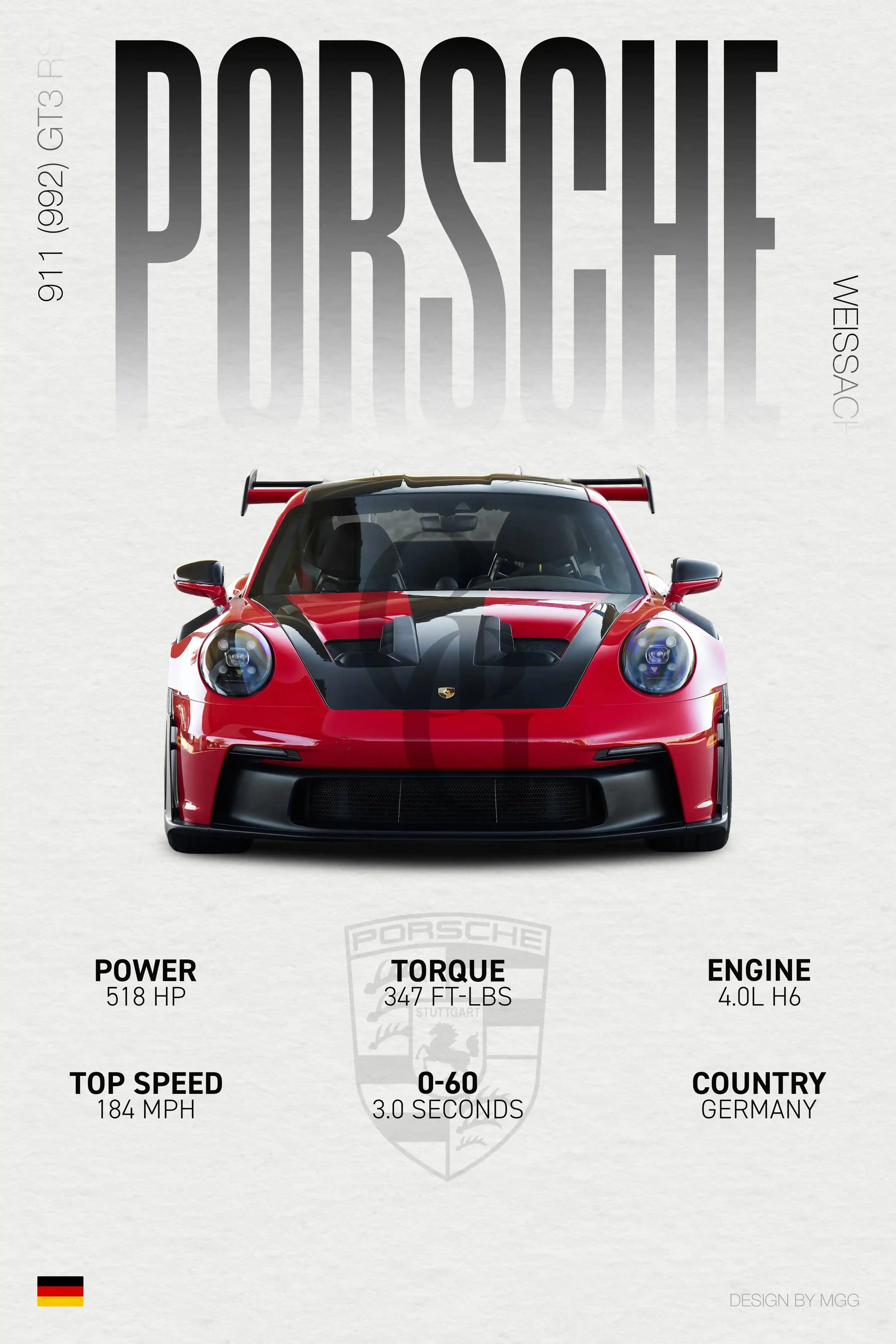 This poster captures the Porsche 992 GT3 RS (Weissach Package) in its most extreme form, highlighting the dramatic aero, exposed carbon elements, and wide, purposeful stance that define its presence. Every wing, vent, and surface exists to generate downforce and control, creating a car that looks as aggressive as it performs.